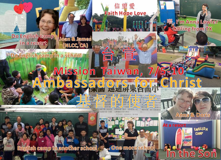 中宣自2007年起每年暑期联合各教会去屏東十餘國小校園舉辦英文福音營,今年台宣的营会要擴大到万丹,加上原來的里港,九如和東港及潮洲, 而中宣要去深圳。這一切都求神旨意的成就。盼望在求問神的祷告中, 衪的呼召臨到您, 去台灣分享衪的愛。