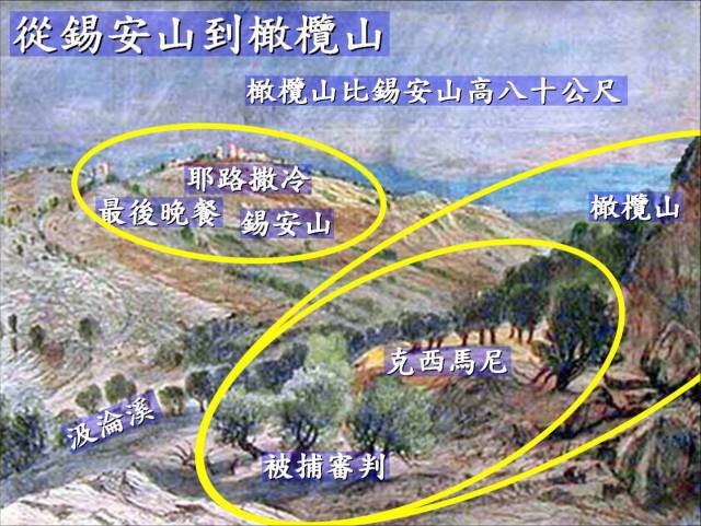 橄欖山與舊城之間明顯有個小山谷,那就是汲淪谷。也可以看得出地勢,錫安山是在比較高的位置,鏡頭拉一拉也會找到聖墓教堂,佔了許多版面又金光閃閃的建築就是金頂殿,原來的圓頂的黃金已經被偷光了,現在看到的是已過世的約旦胡笙國王賣掉他倫敦的房子,花了820萬美金買的85公斤的黃金貼上去的。你可以看見它旁邊有個像是廣場的空地,和另一個比較小、帶著鐵灰色圓頂的建築物,就是阿克薩清真寺。對於猶太人來說,這廣場是他們心中最神聖的地方,因為這是以前聖殿的位置。