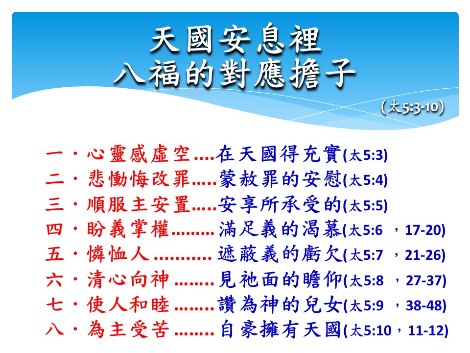 屬主的人學他擔起「擔子」時,便會欣慰的感受到神為他們存留在天國安息裡的八福(希4:9,太5:3-10):