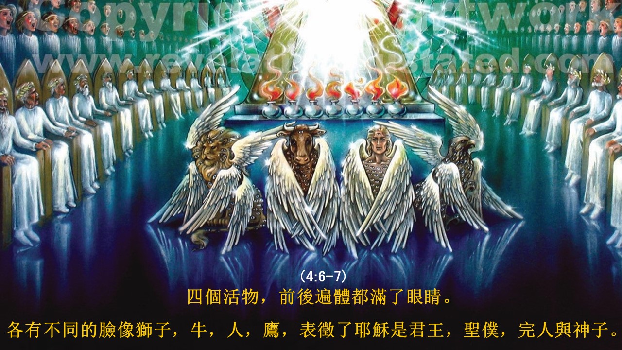 隨後,聖靈帶約翰來到天宮,他震驚於天上聖殿的榮景。他先仰望寶座上神的榮耀,再看到寶座前,帶領教會七樣事工的聖靈。接著,他注意到寶座前水晶般的玻璃海上,有四個活物,前後遍體都滿了眼睛。第一個活物像獅子,第二個像牛犢,第三個臉面像人,第四個像飛鷹。 四活物各有六個翅膀,遍體內外都滿了眼睛。(啓4:1-8)她們同於以賽亞在天上寶殿異象中看到的撒拉弗(賽6:2)及以西結看到的四活物(結1:5)。然而,令他驚訝的是,她們竟然可以進出神和主的寶座,她們的身份是何其的尊貴!又圍在寶座的四周,她們與主和父神是何其的親密! (啓4:6)她們在那裡晝夜不住地稱頌:聖哉!聖哉!聖哉!主神是昔在、今在、以後永在的全能者;在聖靈前帶領以色列族長及教會使徒的二十四長老,俯伏在坐寶座的神面前敬拜。他們都把自己的冠冕放在寶座前,將榮耀、尊貴、感謝頌讚給那坐在寶座上、活到永永遠遠者的神。
