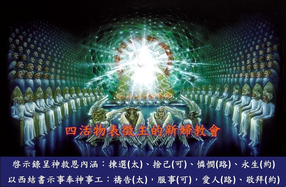 四活物所表徵的成聖教會頌讚神的創造萬物,便在於感恩神先從塵土造了她們,之後再揀選她們藉摩西律法存活,如今從耶穌救恩裡更新了他們,作新造的人,最後在天國復活他們有榮光、強壯的靈性身體(啟21:5,林前15:43-44),成為主耶穌的皇家後裔(啟1:1,6)。 她們在天國時便成為主尊貴的內人,進出神的寶座又親密的圍繞在神四週,在聖靈前帶領了以色列族長和外邦人使徒的二十四位長老,以及周圍許多千千萬萬的天使和穿白袍的聖徒,齊聲頌讚、敬拜神。主再來時迎娶成聖教會為他的新婦,緊隨著他從天降臨,在他御前作王和祭司,掌管千禧天國。並在千禧年的天國結束後,主的新婦要與聖靈在天堂的新天新地裡,一起牧養神的子民。(啟4:8,5:11,1:6,14:1-4,19:7,22:17)